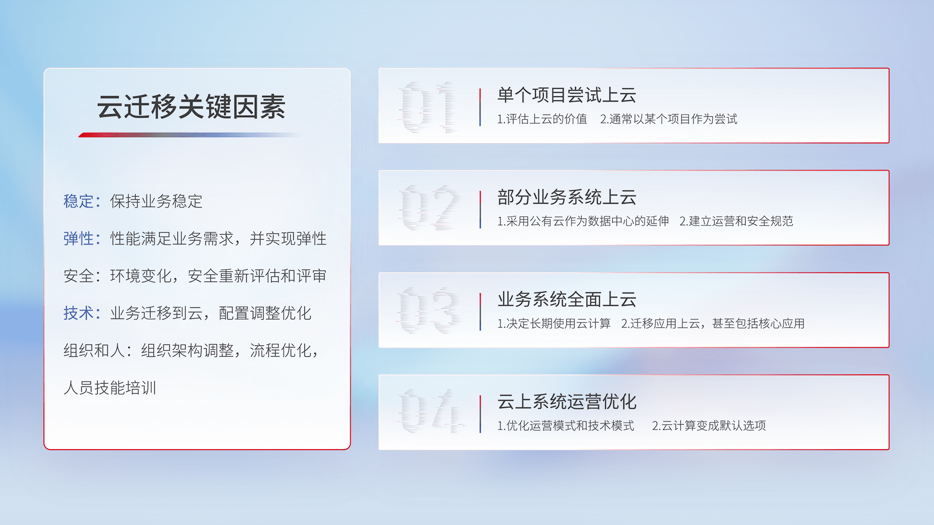 结合实际业务,,,从规划设计、、云平台选型、、、、云原生改造、、数据迁移、、集成交付,,,迁移全过程为客户识别最佳上云路径,,,做好风险识别管理,,,,设计网络架构、、身份权限、、安全审计合规、、、、操作审计、、、日志审计、、、、监控告警策略、、、多站点容灾设计等,,,,对云上基础设施进行整体规划,,提升IT治理水平,,以满足弹性、、、、高可用、、、、高性能的需求。。