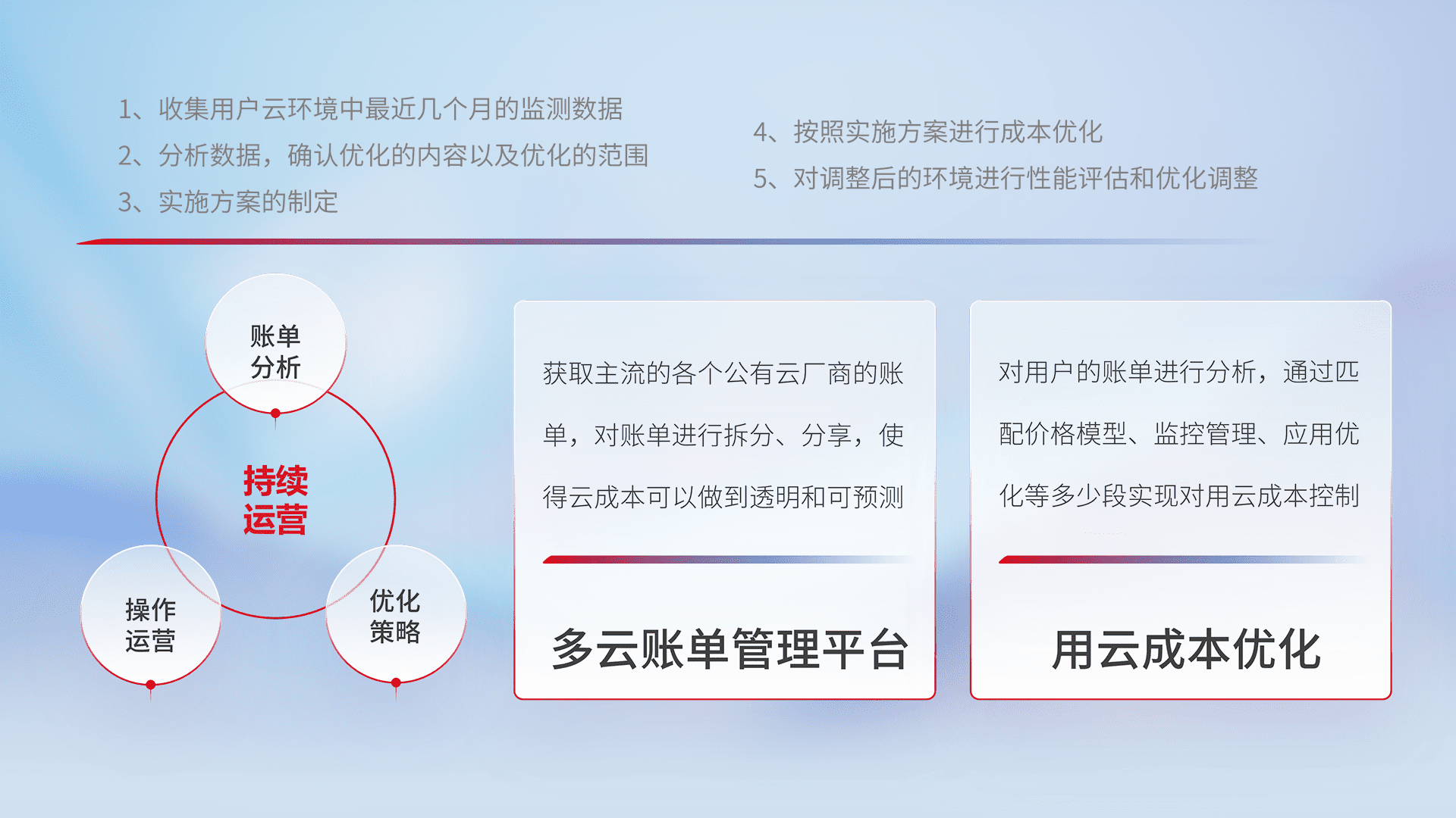通过多云纳管,,,以统一的资源数据模型把客户的云资源进行抽象和封装,,,,进而实现对多云资源的统一操作,,,,保障云资源管理的可靠性、、、稳定性与可用性。。。。量身定制化运维内容,,,,配置、、、开发运维、、补丁管理、、备份、、、监控、、、认证和访问管理、、、审计和日常巡检等,,,保障在用云过程中的可靠度,,,稳定度以及高可用率。。